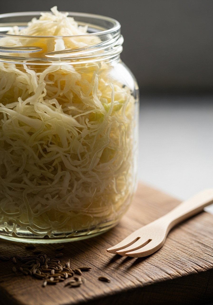 Pack cabbage into jar with a spoon, pressing to submerge in its brine. Add caraway and whey if using. - Weight & Ferment: Keep submerged