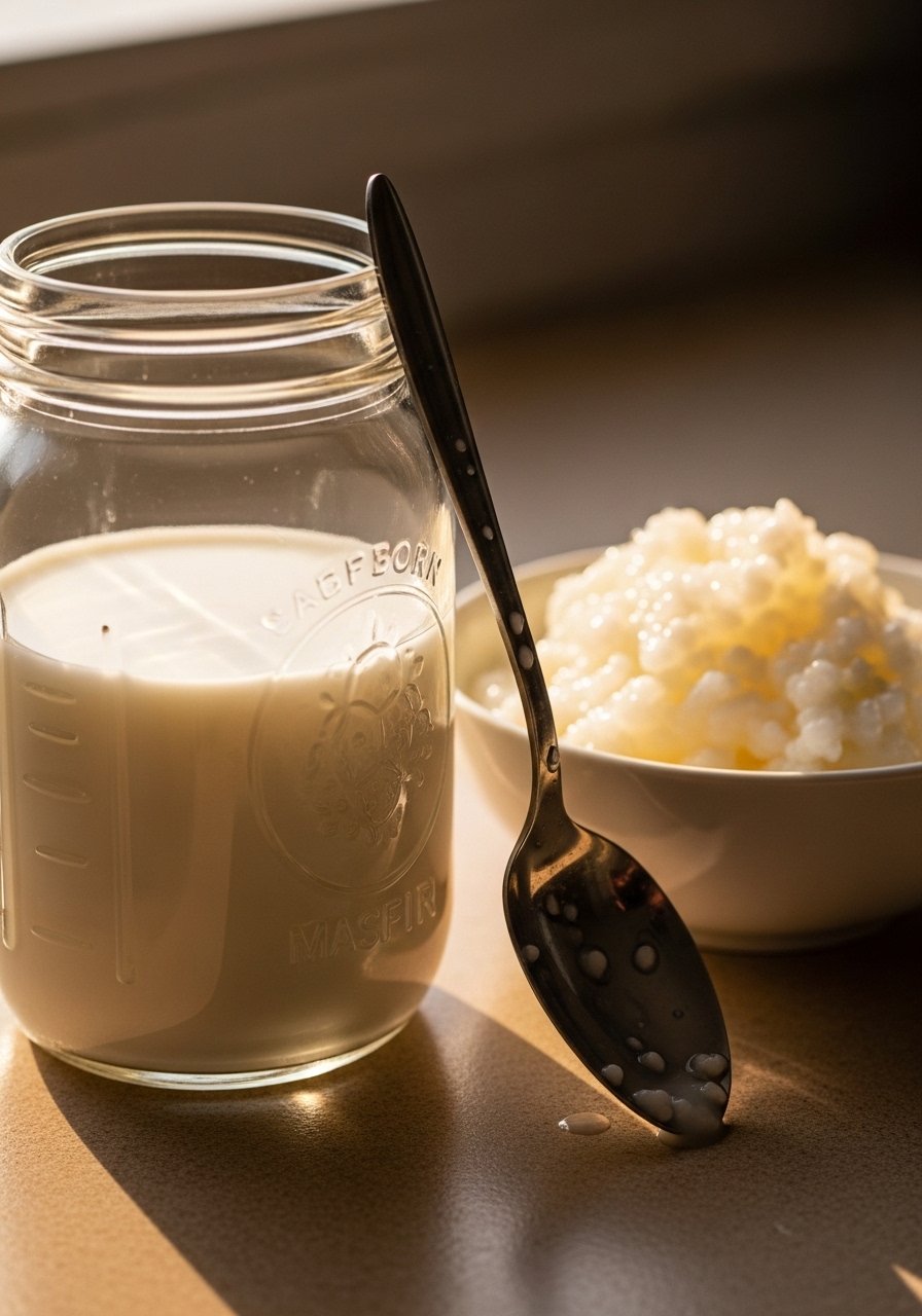 Place kefir grains in jar and pour room-temperature milk over them. - Cover: Let ferment