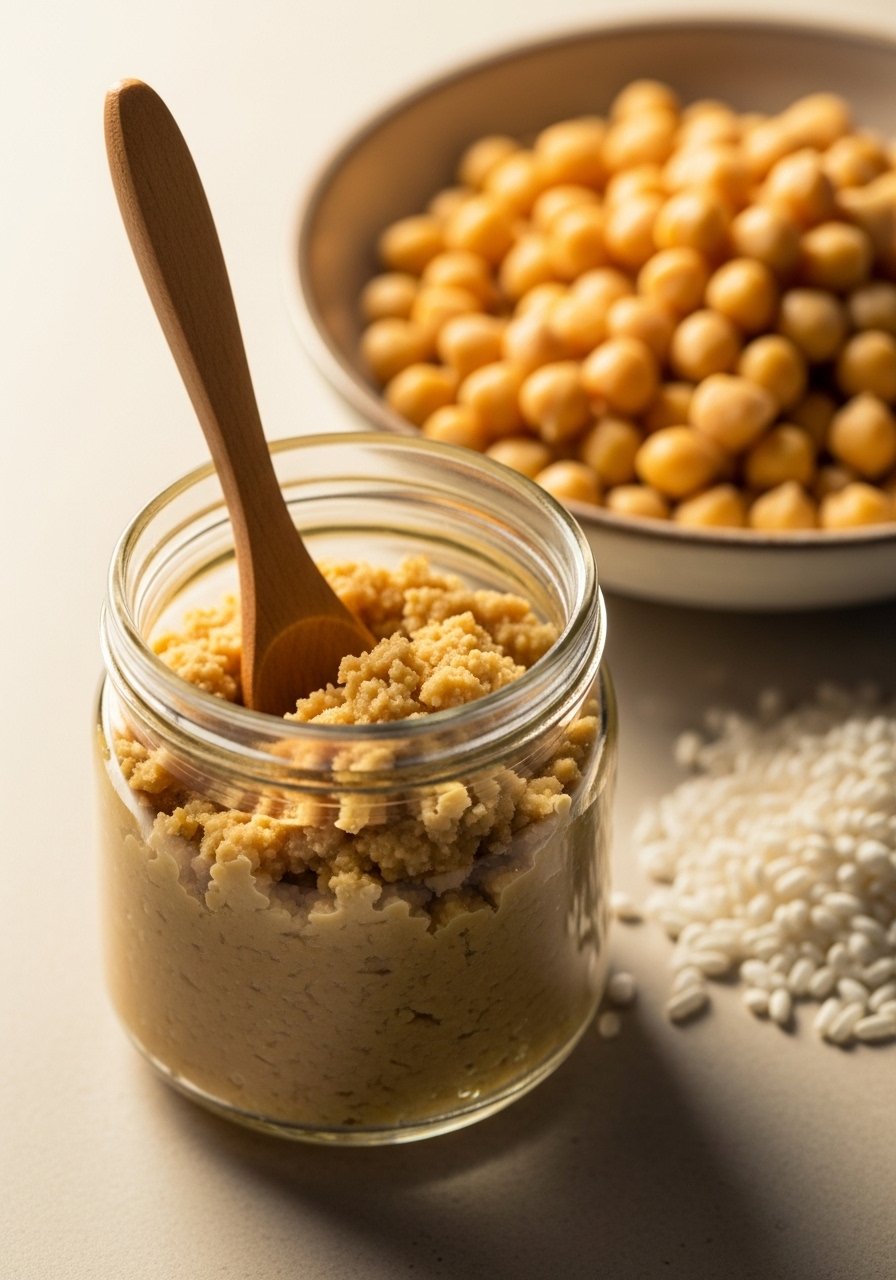 Mash chickpeas, stir in rice koji and salt until paste forms. - Pack: Jar tightly