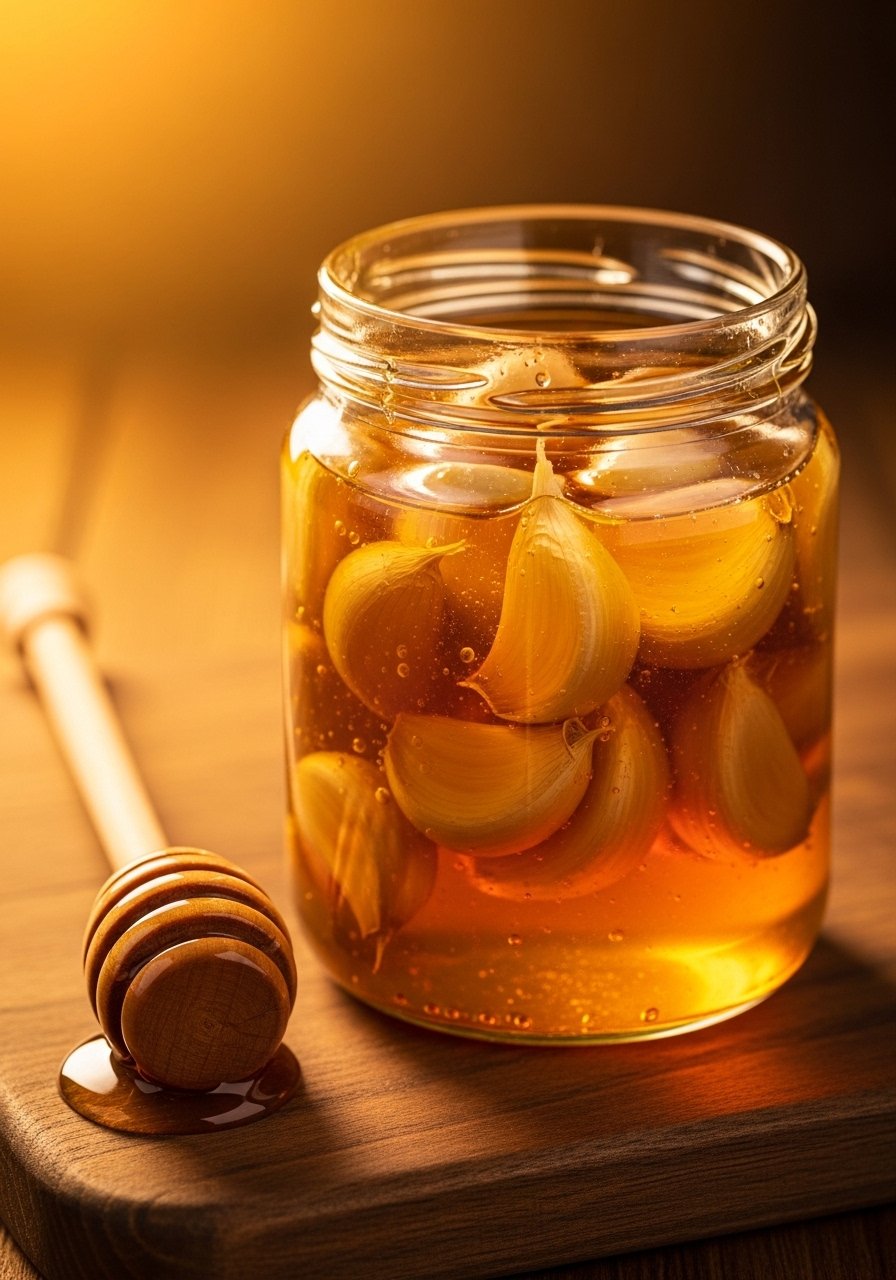 Garlic cloves fermenting in honey become mellow and probiotic-rich. Use the infused honey for dressings or straight spoonfuls for a soothing boost.