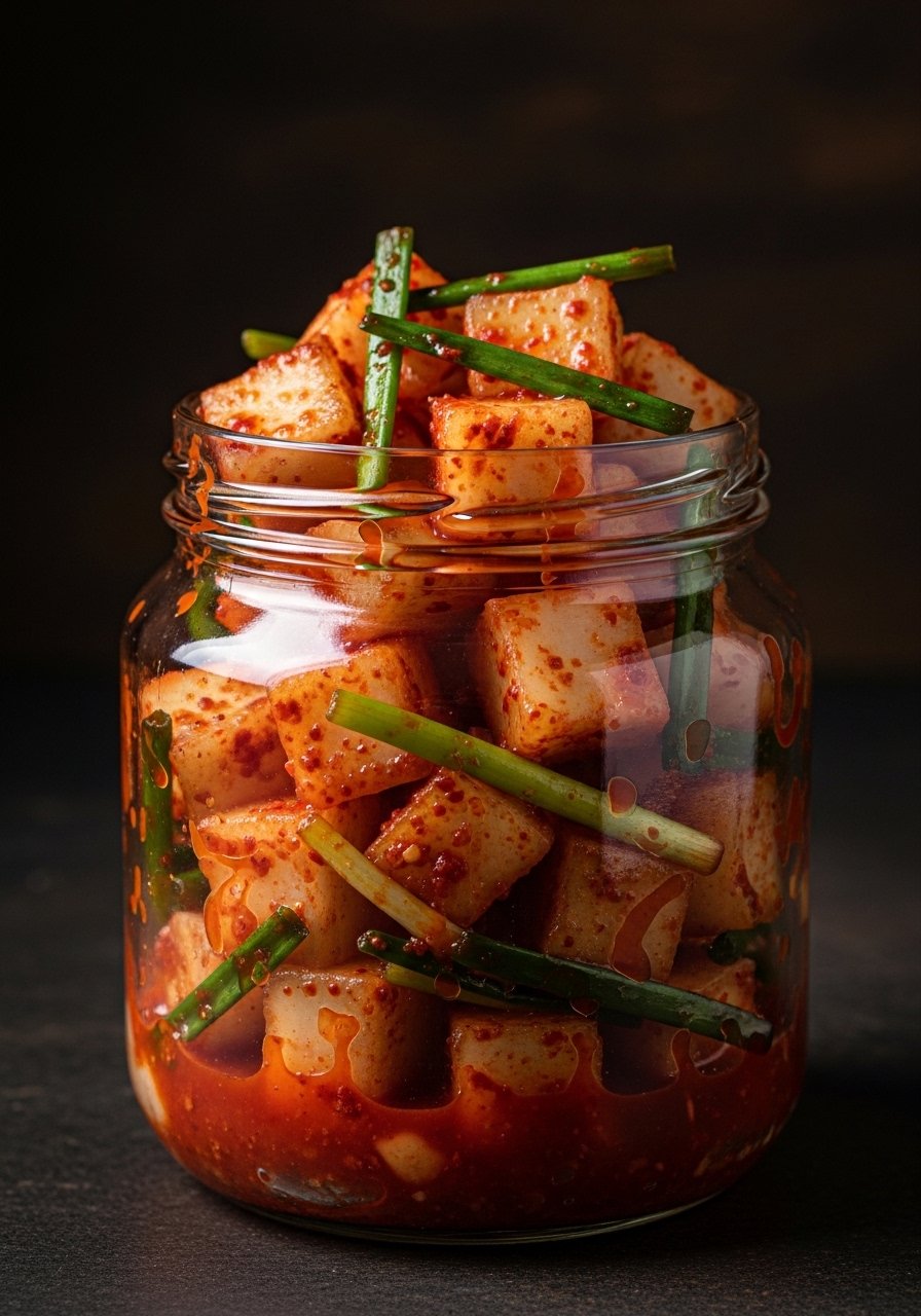 Cubed radish kimchi is crunchy and spicy with a peppery kick. The texture stays crisp and adds great contrast to softer dishes.