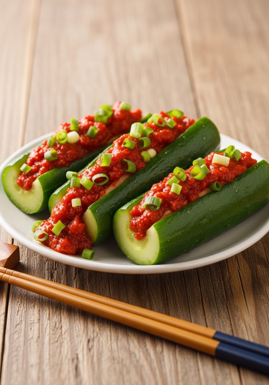 Combine gochugaru, fish sauce, garlic, scallions, and sugar. - Stuff: Fill cucumbers