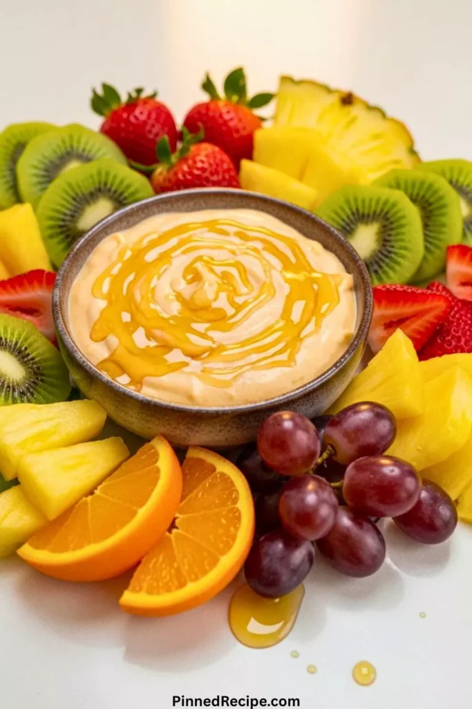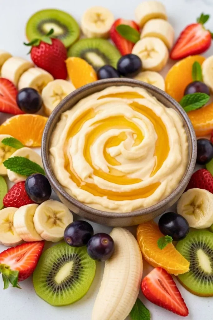 Arrange fresh fruit on a platter and serve alongside the dip. You can drizzle a little honey or sprinkle nuts on top for extra flair. For parties, serve in a decorative bowl with toothpicks for easy dipping.