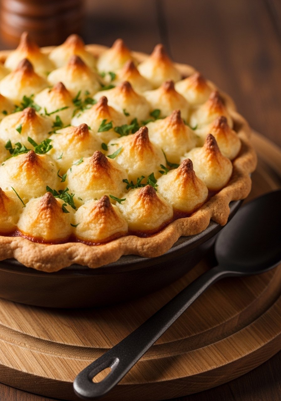 - Assemble and bake: Spoon the filling into a 9×9-inch casserole. Spread mashed potatoes on top. Bake at 375°F for 25–30 minutes until edges bubble and top is golden.