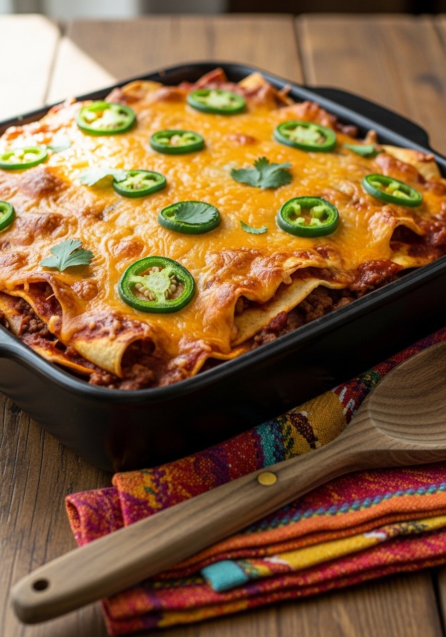 Spicy, saucy, and shareable—this enchilada casserole layers tortillas, seasoned ground deer meat, black beans, and creamy cheese for a crowd-pleasing Mexican-inspired bake.