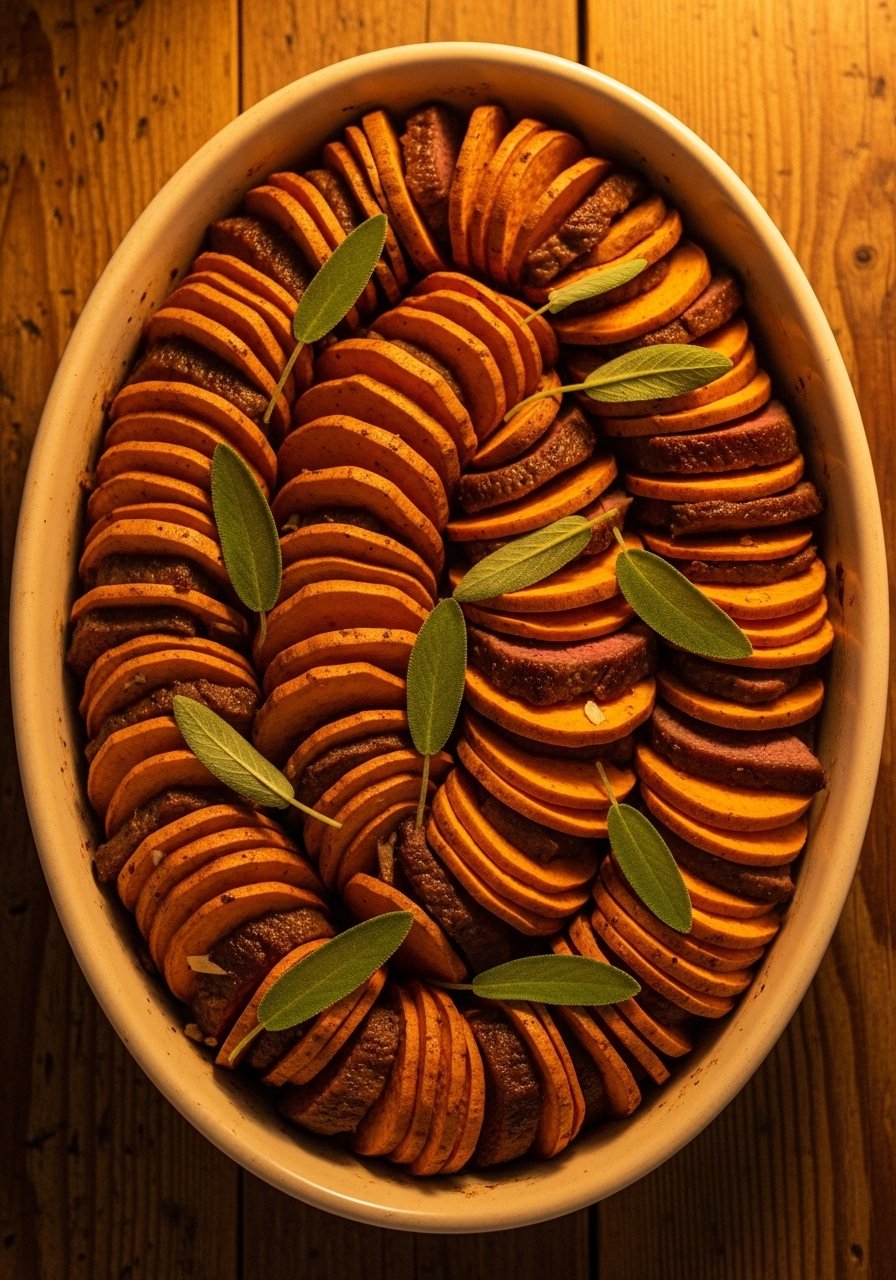 Sweet, savory, and aromatic—this casserole layers spiced ground deer meat with thin sweet potato slices and fresh sage for a cozy autumn dinner.