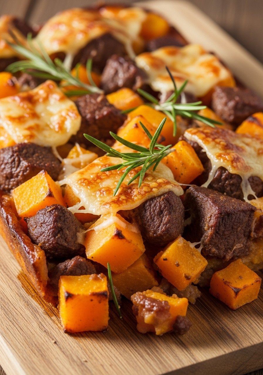 Roasted butternut brings sweetness to savory venison in this cozy casserole. Add sage and a touch of maple for a comforting fall dish.