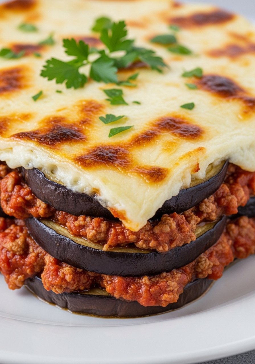 - Assemble layers: Layer eggplant and ragu in a casserole, pour béchamel over top.