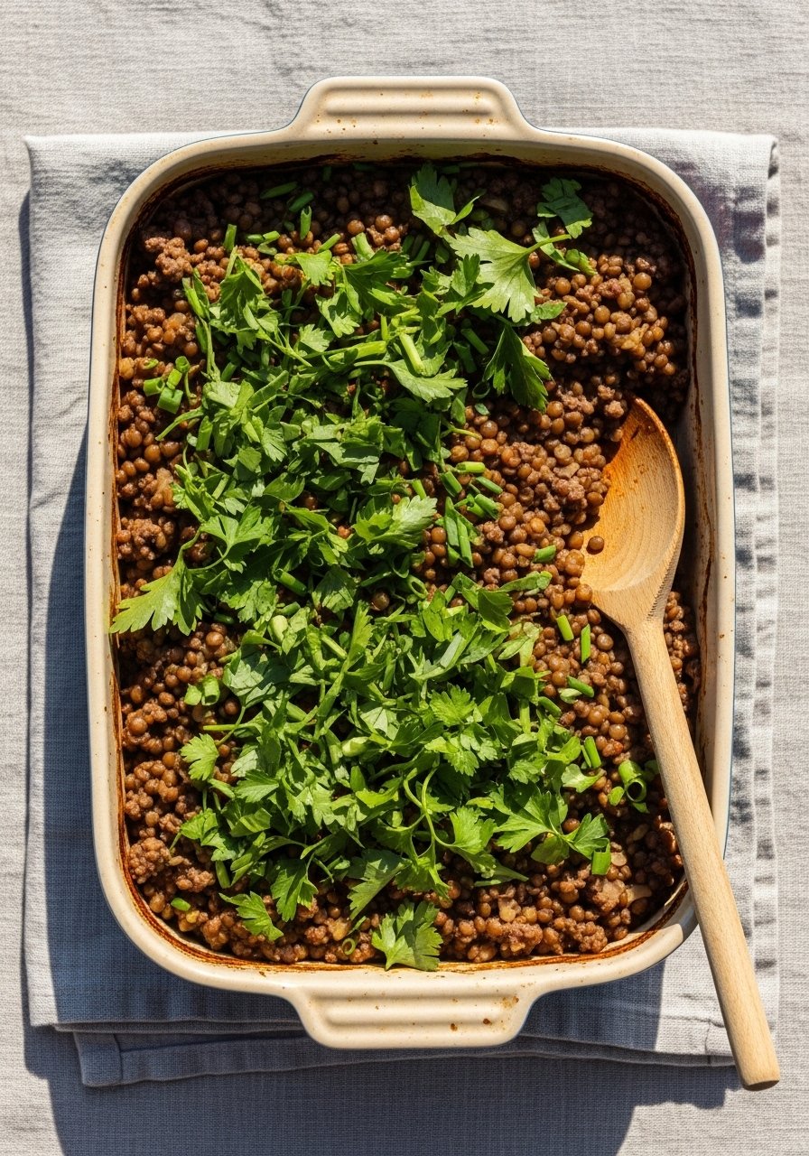 Hearty lentils and lean ground deer meat create a nourishing, fiber-rich casserole. Fresh herbs brighten the dish for a balanced, comforting meal.