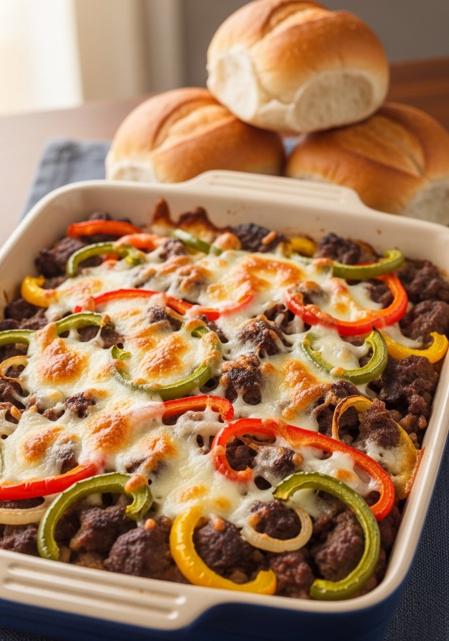 All the flavors of a Philly cheesesteak in casserole form. Tender ground deer meat, sautéed peppers, onions, and melty provolone—great for parties.