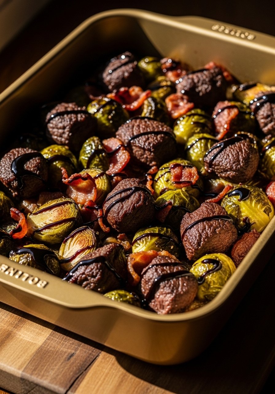 - Combine and top: Mix venison, bacon, and sprouts in a casserole. Drizzle with balsamic and top with cheese.