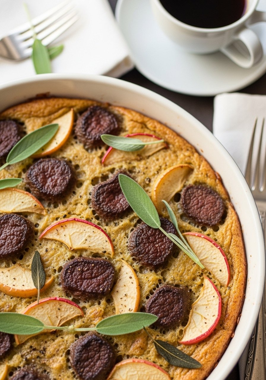 Sweet apples and aromatic sage pair with ground deer meat for a savory-sweet breakfast or brunch casserole. Great for feeding a crowd in the morning.