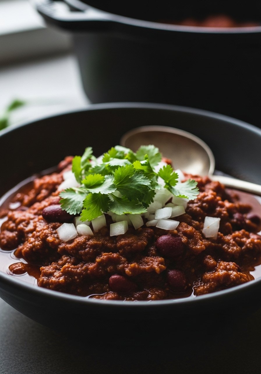Hearty, slightly spicy chili that reheats beautifully. Thick texture with beans, tomatoes, and savory spices makes it perfect for lunches or simple dinners during the week.