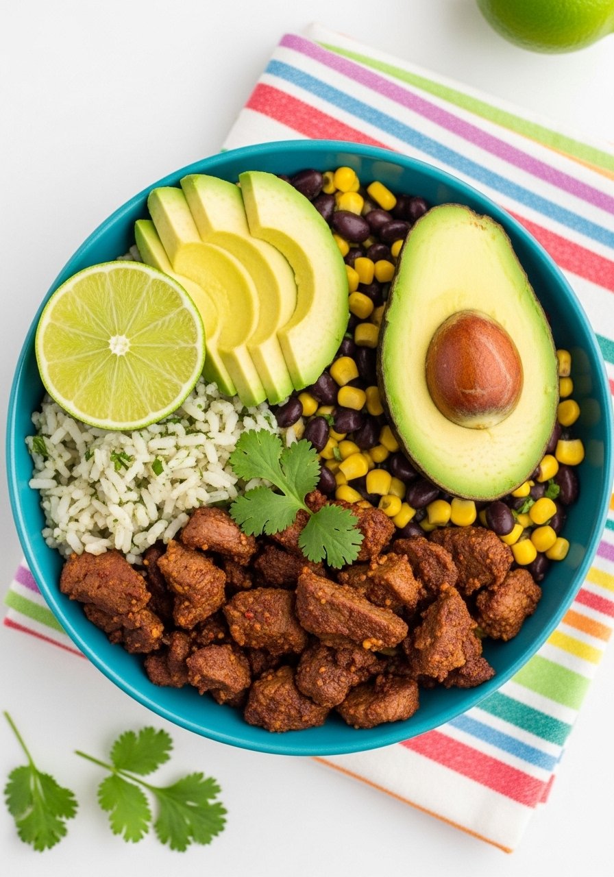 Spiced ground venison with zesty rice and beans for customizable bowls. Perfect for grab-and-go lunches—easy to top with fresh avocado and salsa.