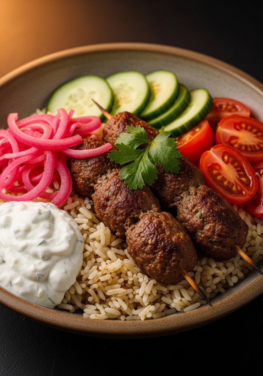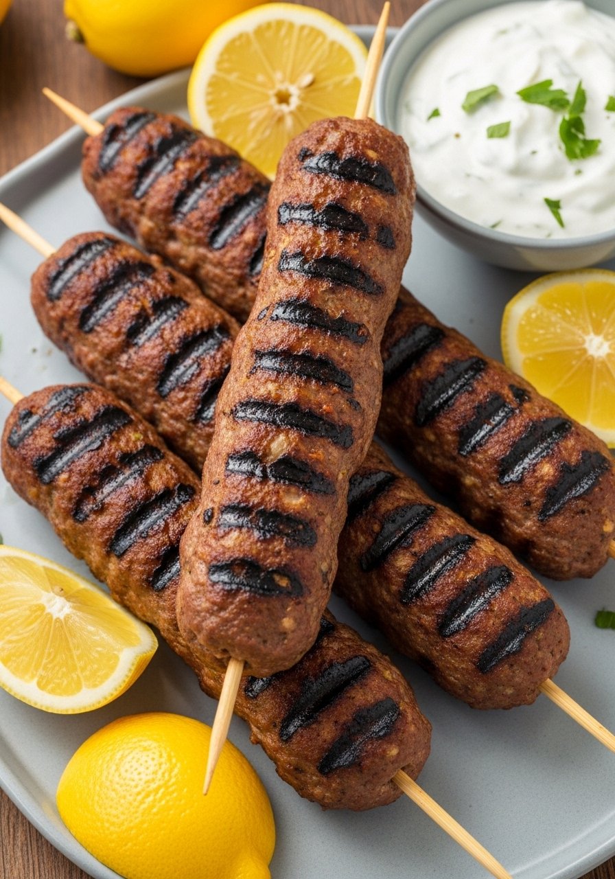 Grilled kofta meatballs threaded on skewers—great hot or cold and ideal for meal-prep lunches with a refreshing dip.