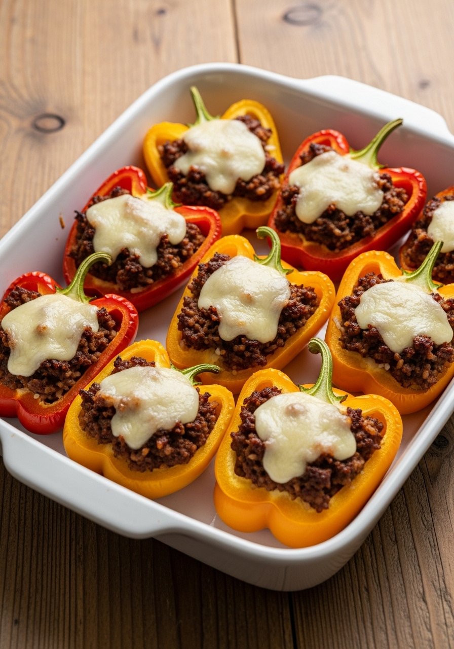- Fill and bake: Spoon into peppers, top with cheese, cover with foil and bake 30–35 minutes until peppers tender.