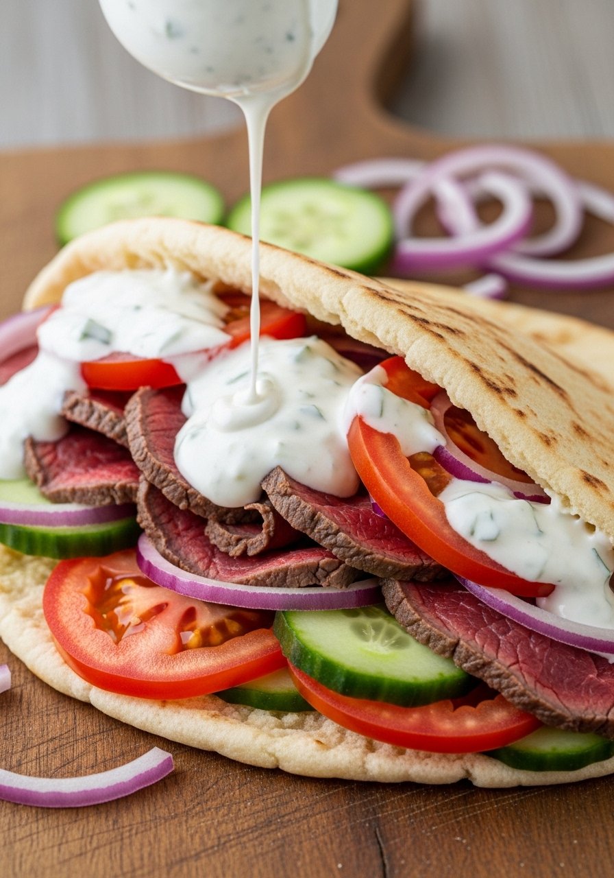 - Assemble pockets: Spoon meat and salad into pitas and drizzle with tzatziki.