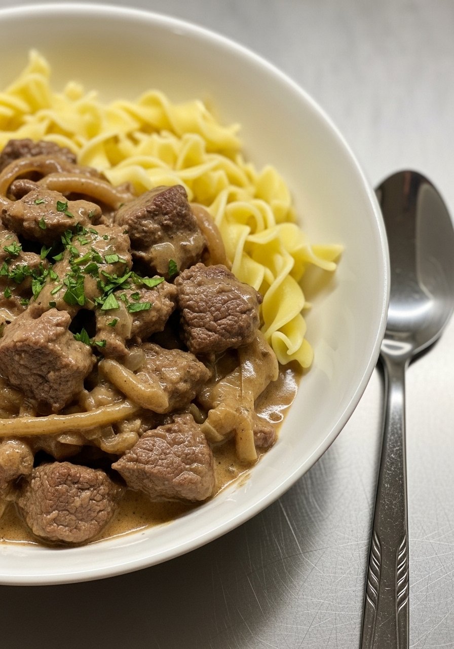 Creamy, savory stroganoff made with ground venison and mushrooms. Keeps texture and reheats gently for weeknight comfort.