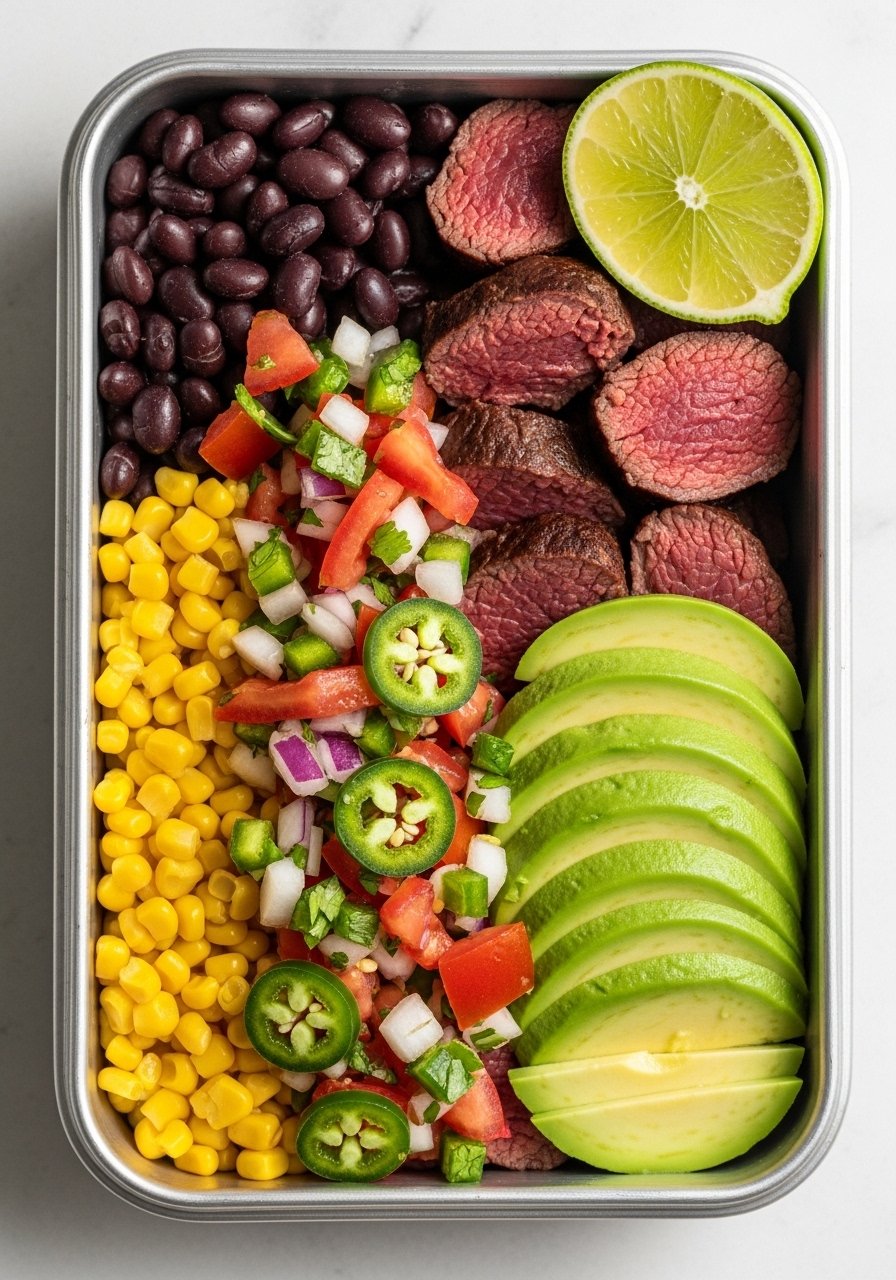 - Assemble bowls: Divide rice, beans, corn, and seasoned venison among containers.