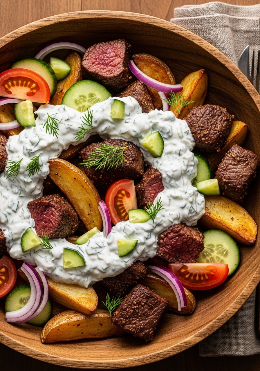 - Prepare bowls: Arrange potatoes, veg, and venison in bowls and drizzle with tzatziki.