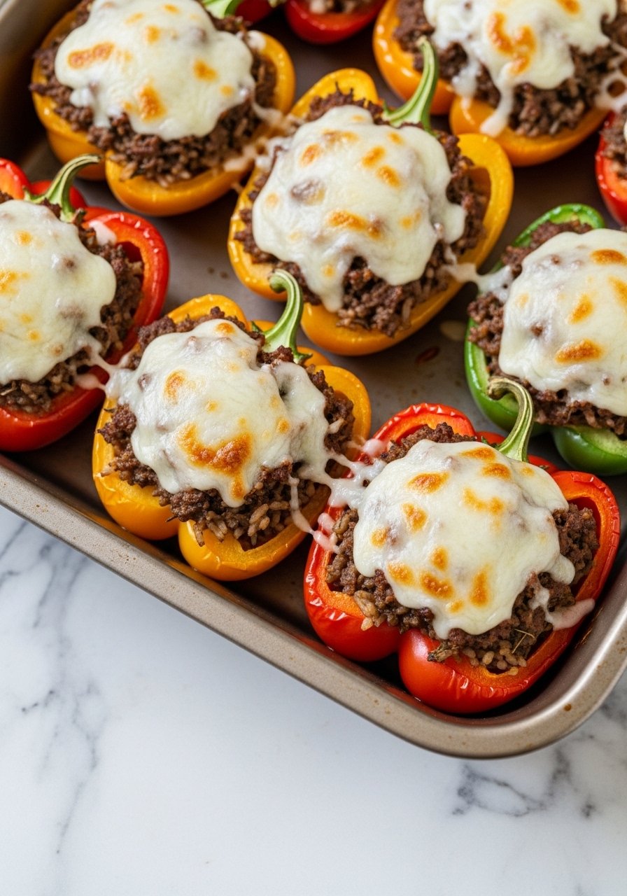 - Stuff: Spoon filling into pepper halves and top with mozzarella.