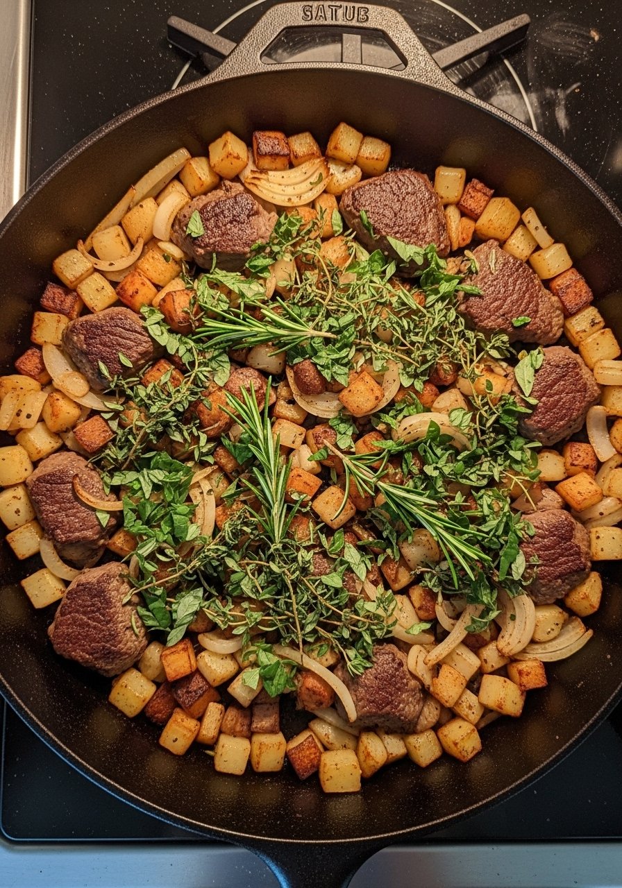 - Crisp Potatoes: Heat oil in a skillet over medium-high. Cook potatoes 10–12 minutes until golden and tender.