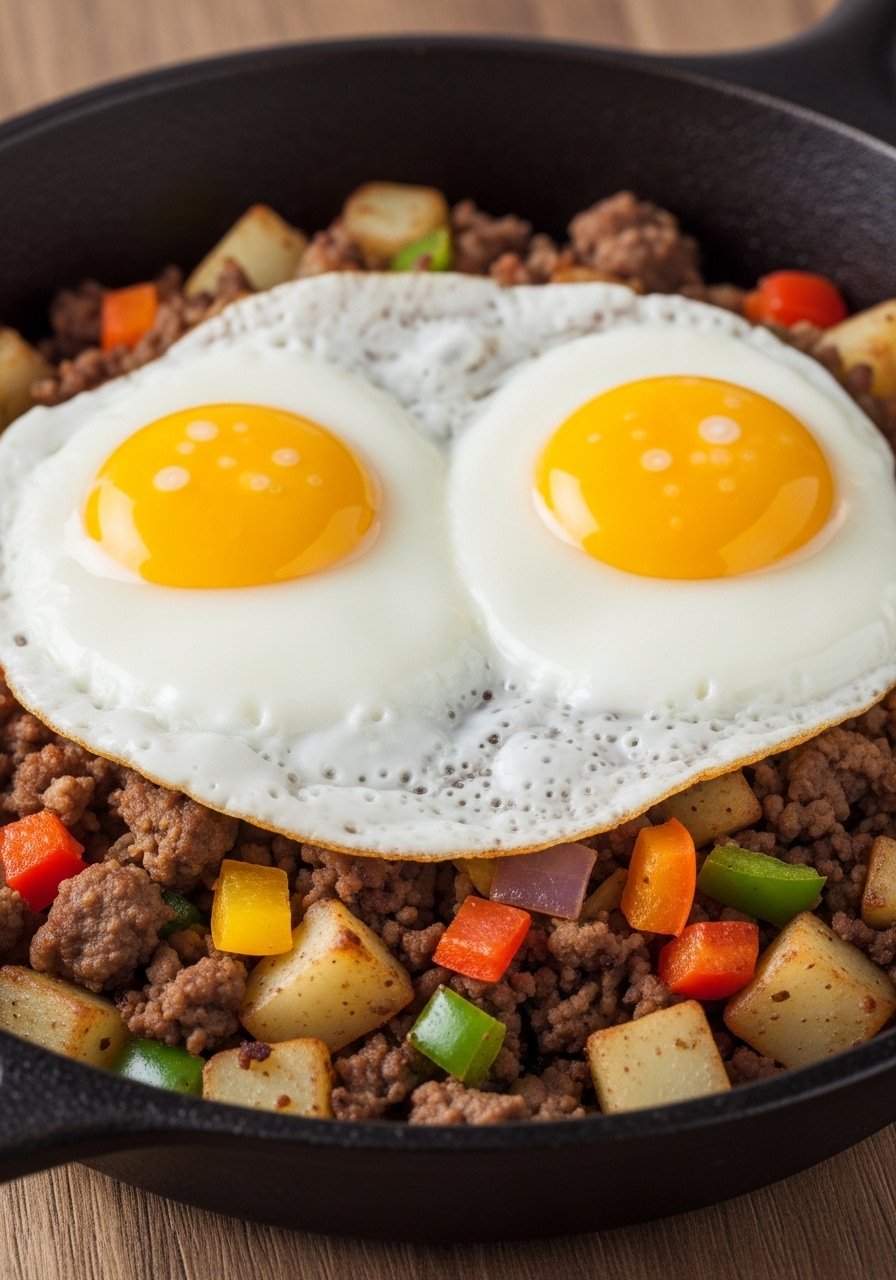 - Top with Eggs: Make wells and crack eggs into each. Cover and cook 4–6 minutes until eggs set to your liking.