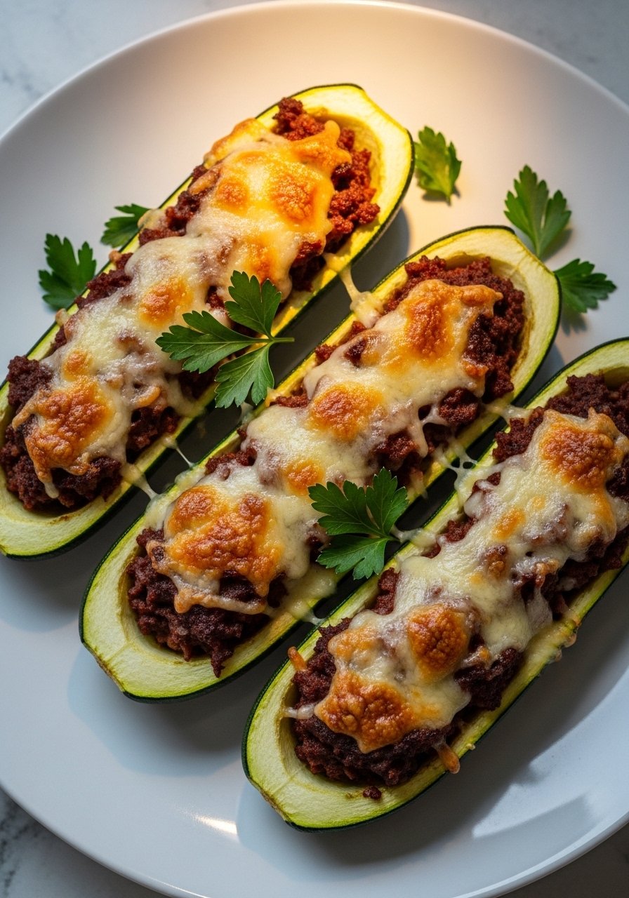 Low-carb and colorful, these zucchini boats are stuffed with seasoned deer and topped with bubbly cheese. Easy to prepare and bake.