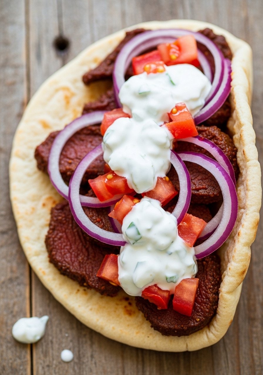 - Assemble: Fill pitas with meat, tomatoes, onion, and a generous spoon of tzatziki.