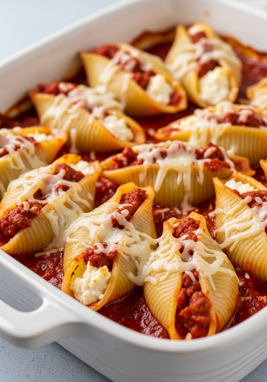 - Stuff Shells: Fill shells with mixture and place in a baking dish with sauce. Sprinkle mozzarella on top.