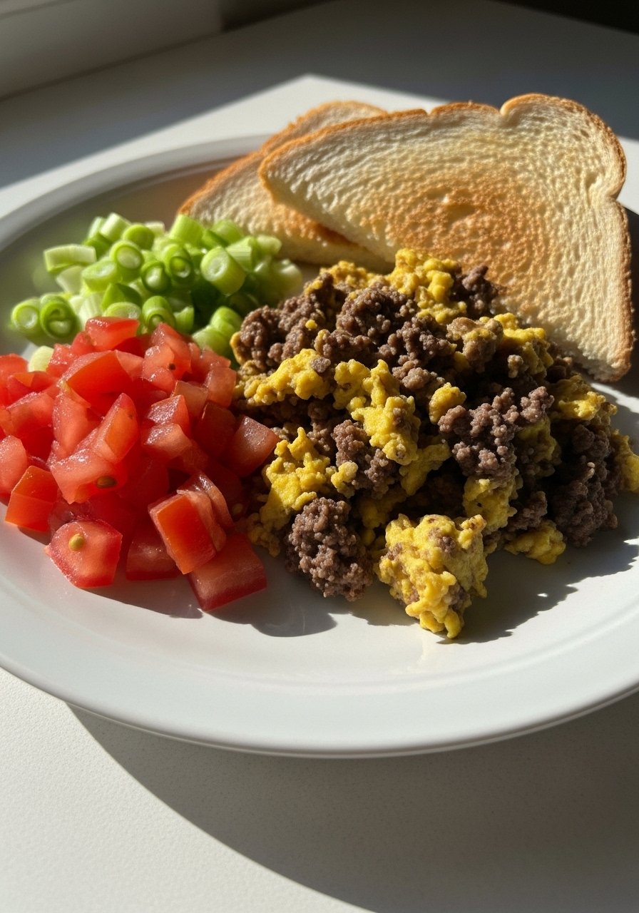 - Add eggs to skillet: Reduce heat to medium-low and pour eggs over meat mixture. Let sit 15–20 seconds.