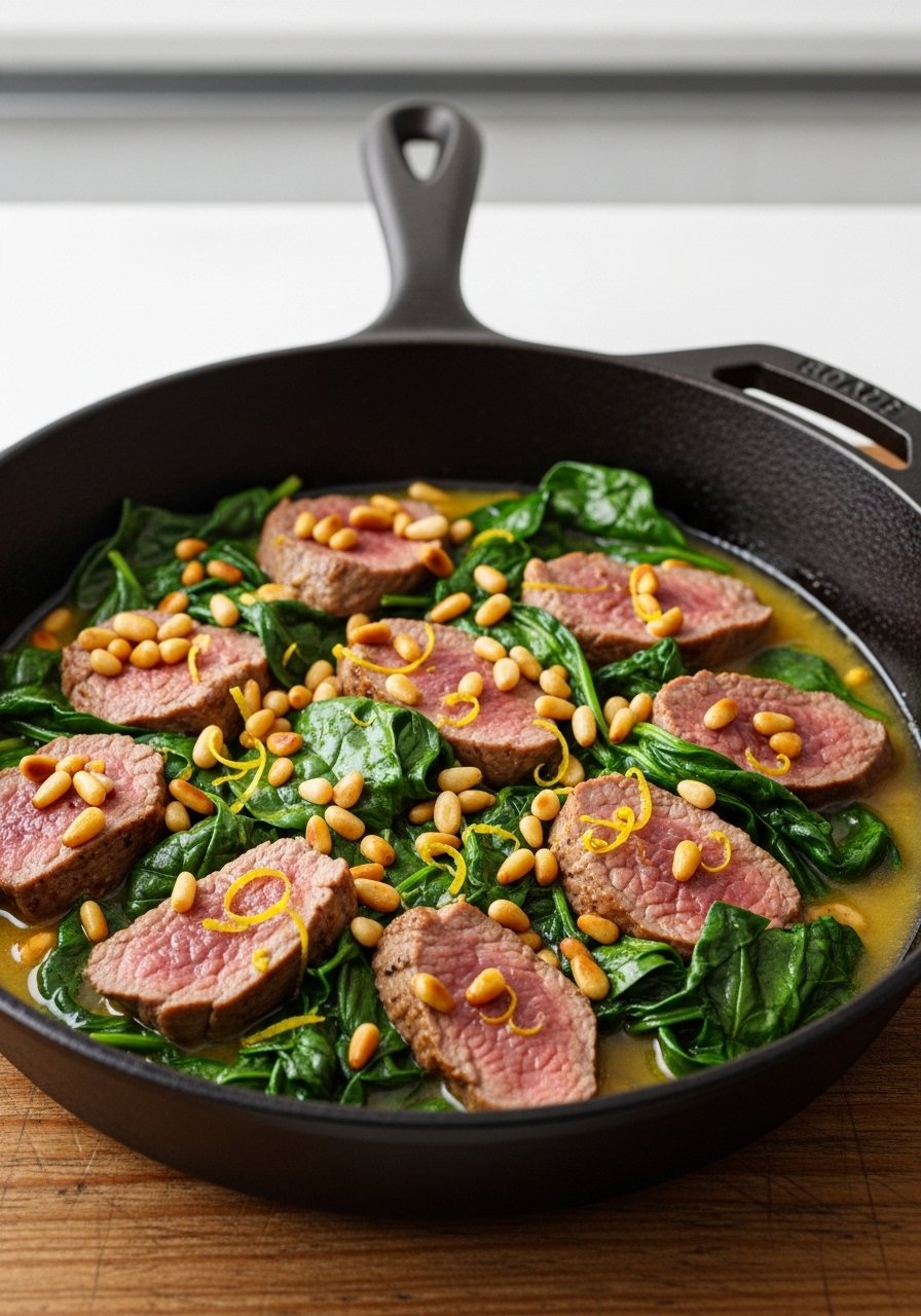 16. Lemon-Garlic Venison and Spinach Skillet
