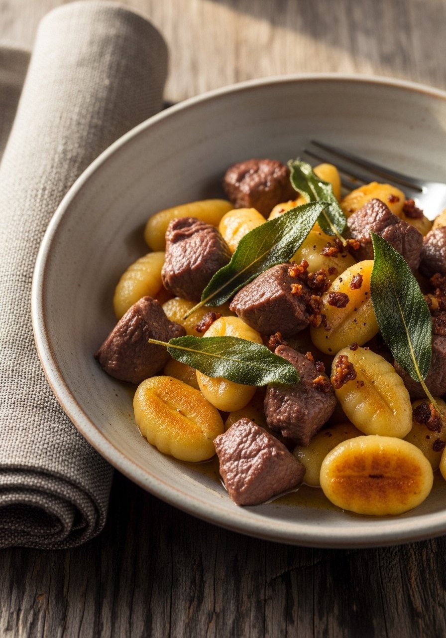 Pillowy gnocchi and browned venison get a nutty sage-butter finish. Quick sear, toss, and serve — the browned sage leaves add aroma and a crisp texture.