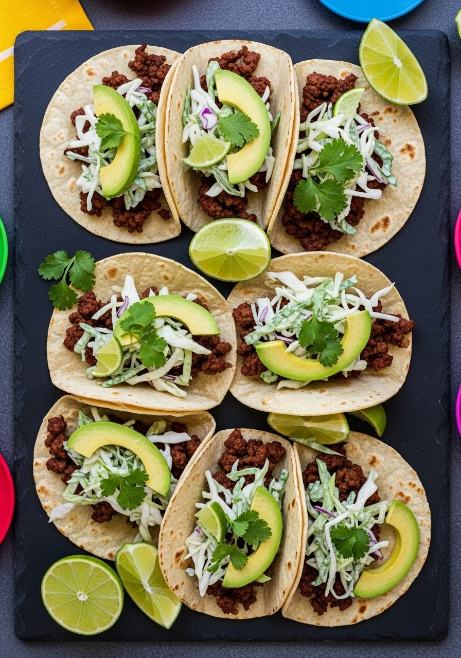 - Assemble Tacos: Layer meat, slaw, avocado, and salsa. Serve immediately.