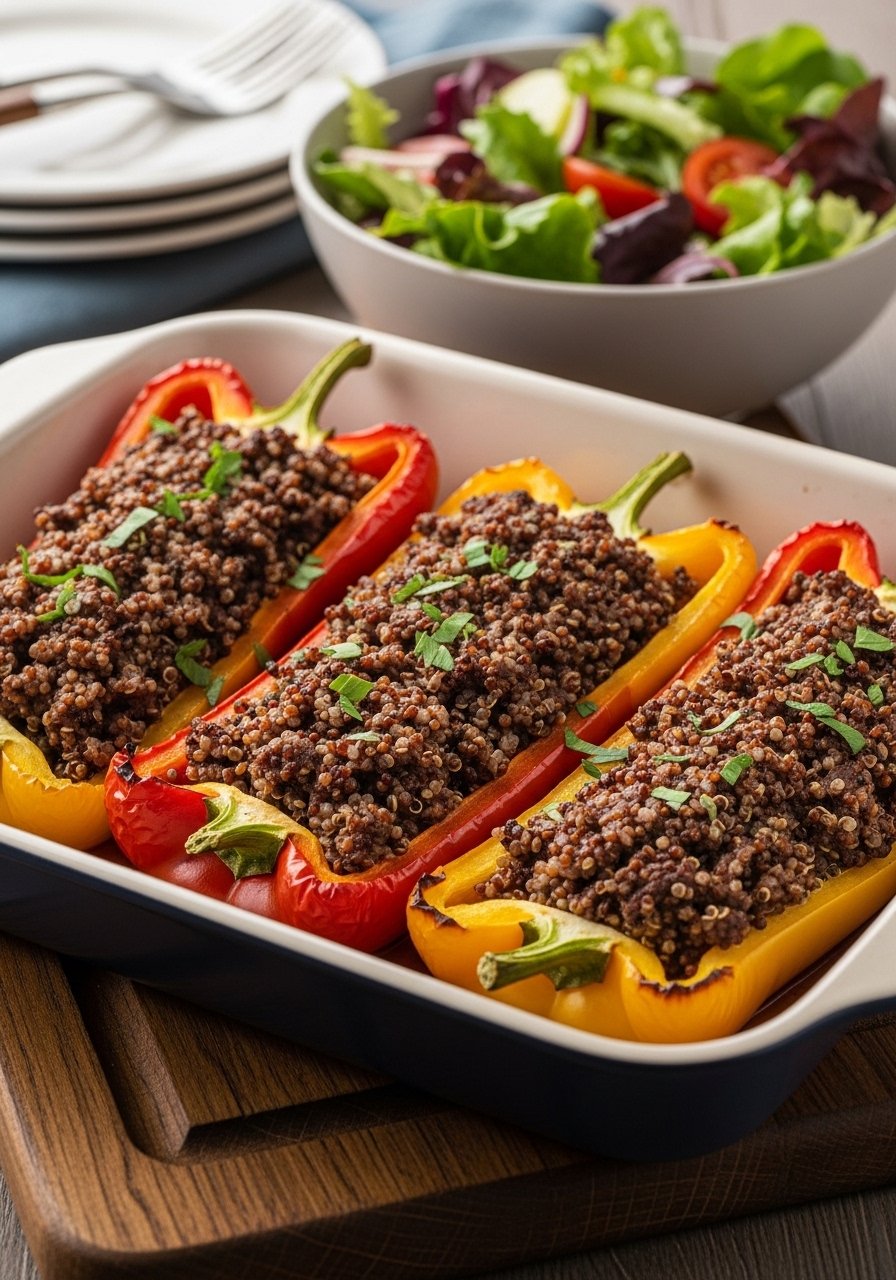 Protein-packed stuffed peppers with quinoa for whole-grain goodness. Baked until peppers are tender and tops are slightly crisp.