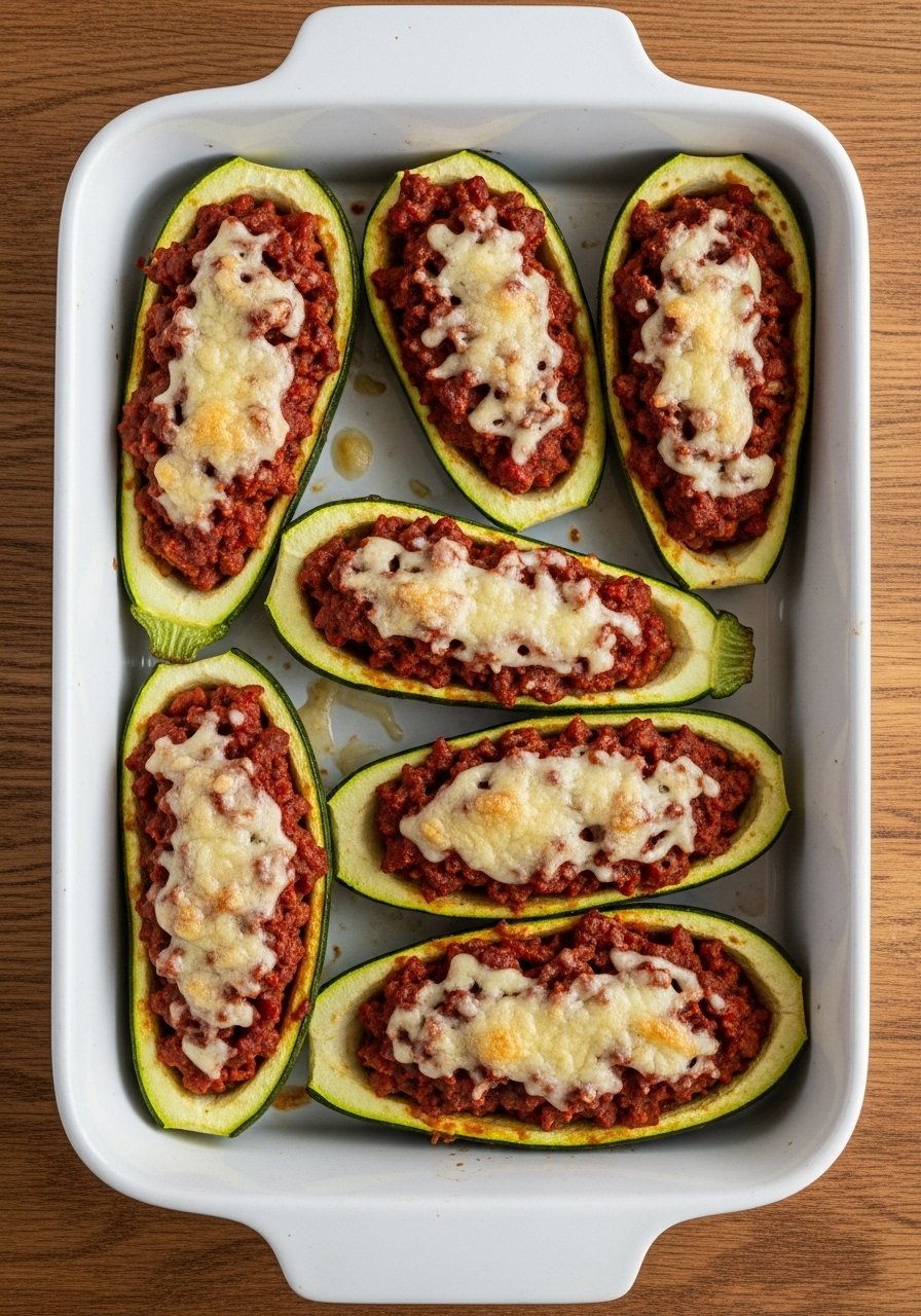 - Fill & Bake: Spoon filling into zucchini halves, top with cheese, bake 18–22 minutes until zucchini is tender and cheese is melted.