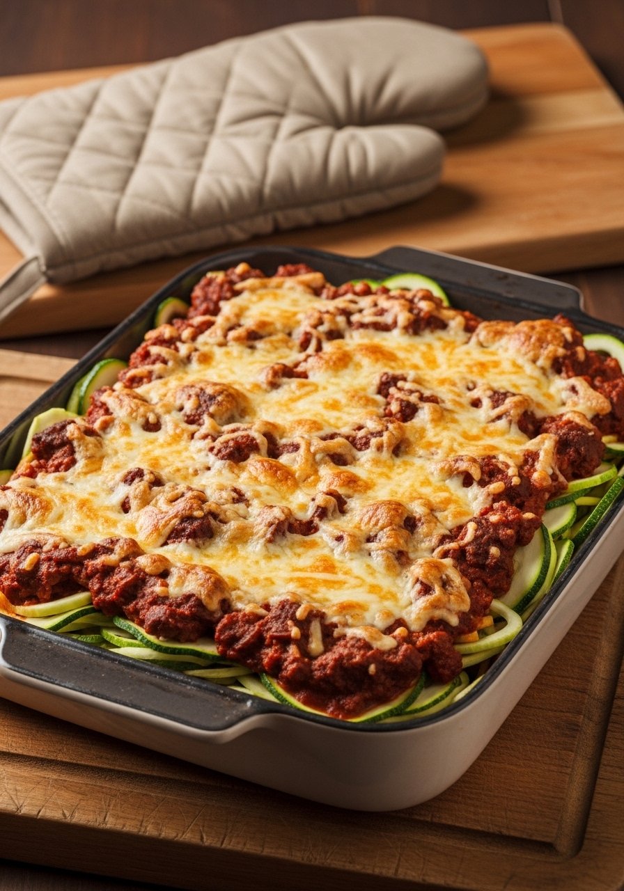 - Bake: Cover and bake 25–30 minutes. Uncover and broil 2–3 minutes for a golden top. Rest 10 minutes before slicing. (Tool tip: Spiralizer helps make zucchini noodles fast.)