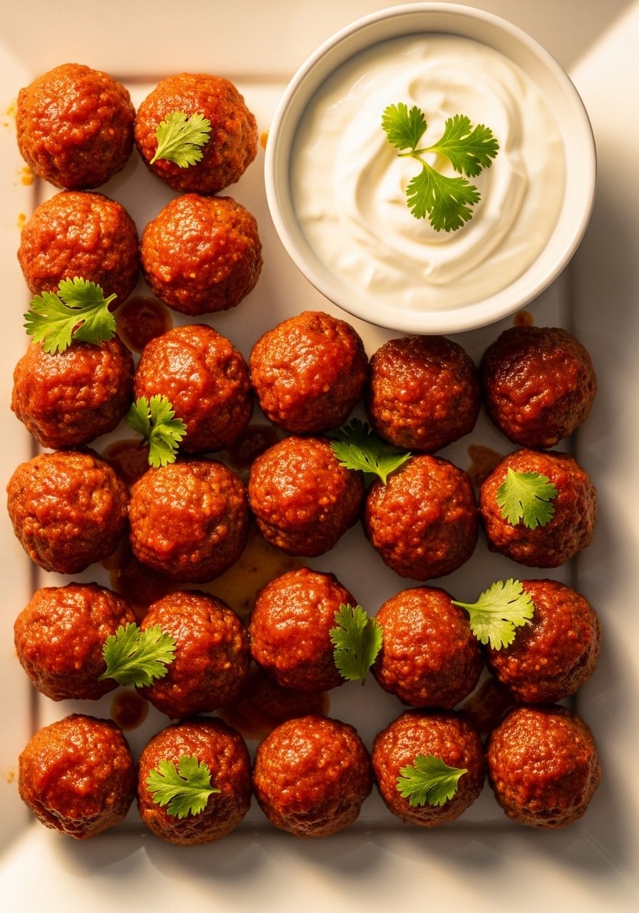 - Serve: Plate meatballs with dip and fresh herbs for garnish.
