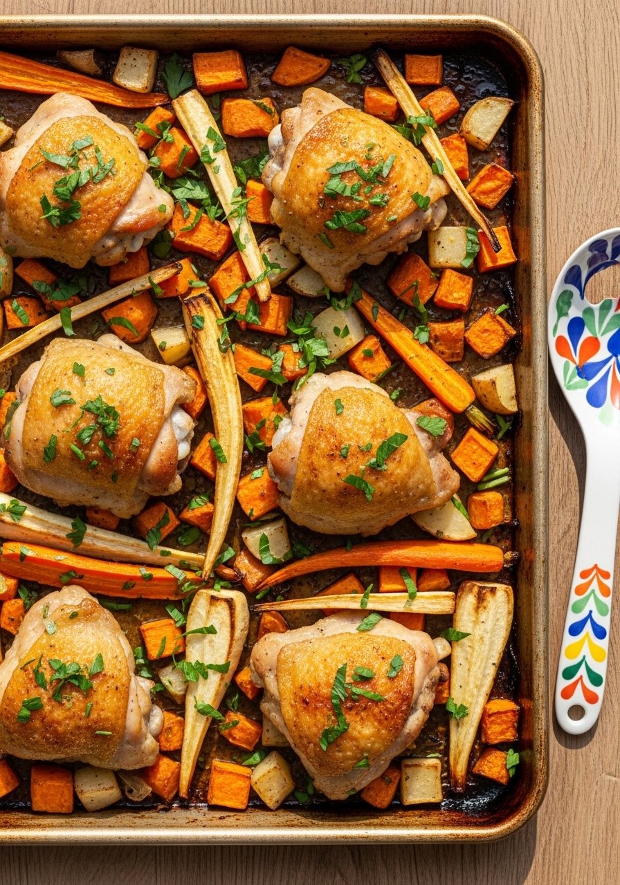 One-pan dinners keep cleanup easy. Roasting chicken with root vegetables creates caramelized edges and comforting flavors. Great for meal prep and balanced family meals.