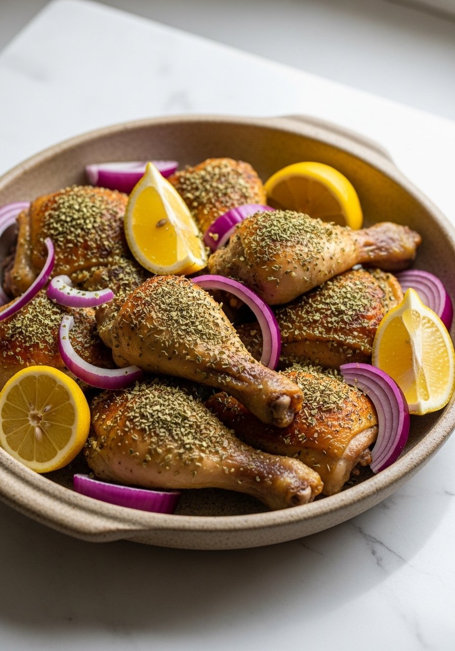 - Roast Together: Arrange chicken with olives and lemons and roast 35–40 minutes until 165°F (74°C) and fragrant.