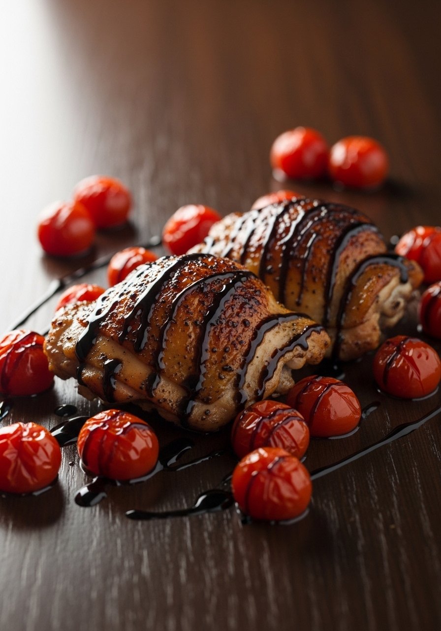 Balsamic adds tangy-sweet depth with minimal sugar. Cherry tomatoes roast into jammy bursts that pair perfectly with the chicken. Serve with steamed greens or cauliflower rice.