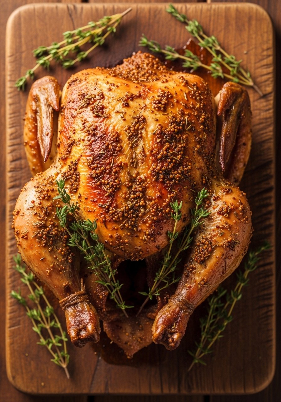 - Make Rub: Mix mustard, herbs, oil, salt, and pepper. Rub over entire chicken and under skin where possible.