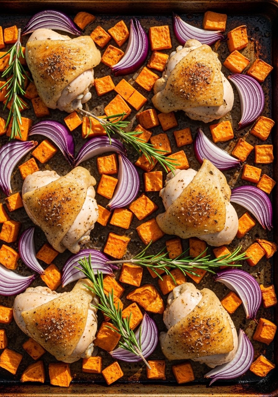 Sweet potatoes roast alongside chicken for a nutritious, colorful meal. The natural sweetness complements savory spices for an easy one-pan dinner.