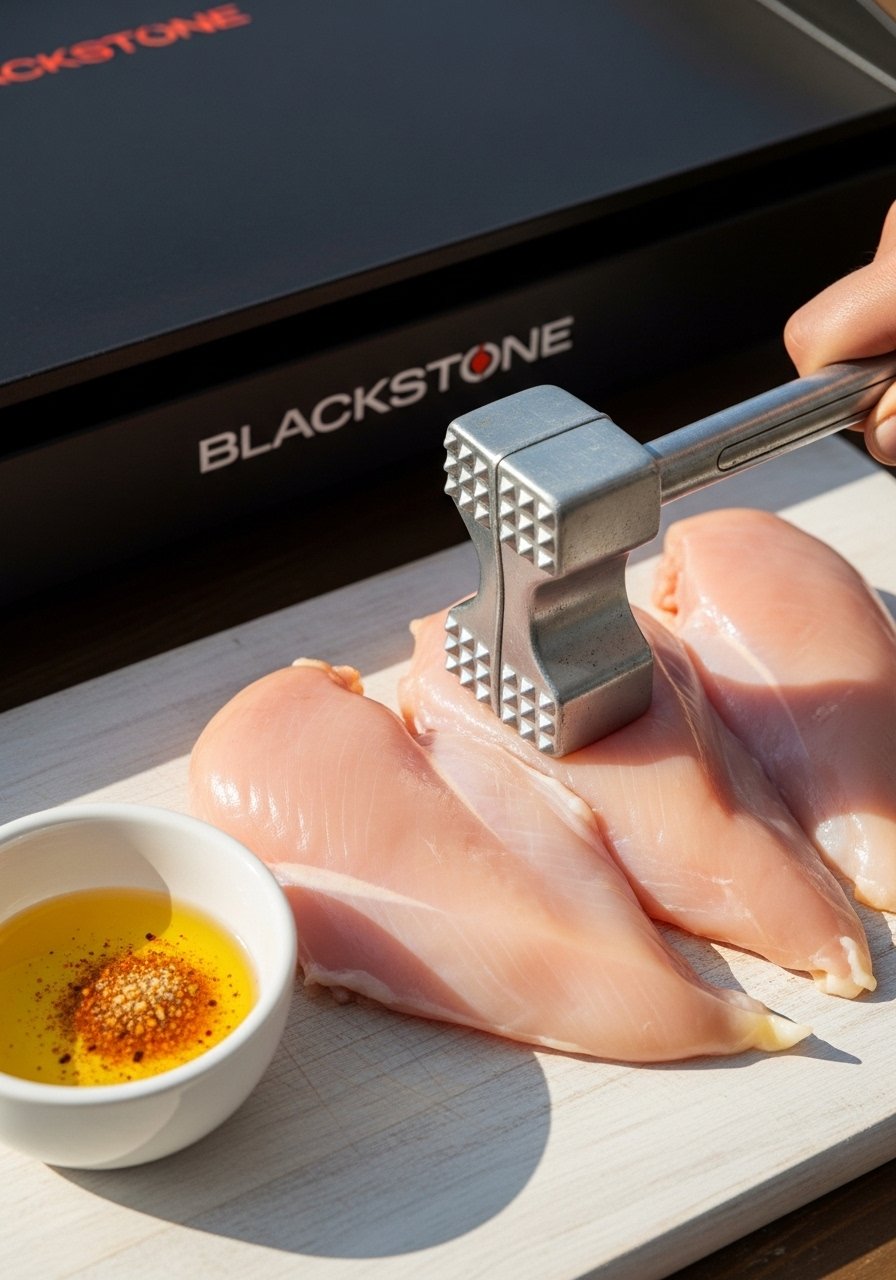 Place the chicken between parchment and gently pound to an even thickness (about 1/2–3/4 inch). This single step prevents the most common Blackstone problem: overcooking the edges while waiting on the center.