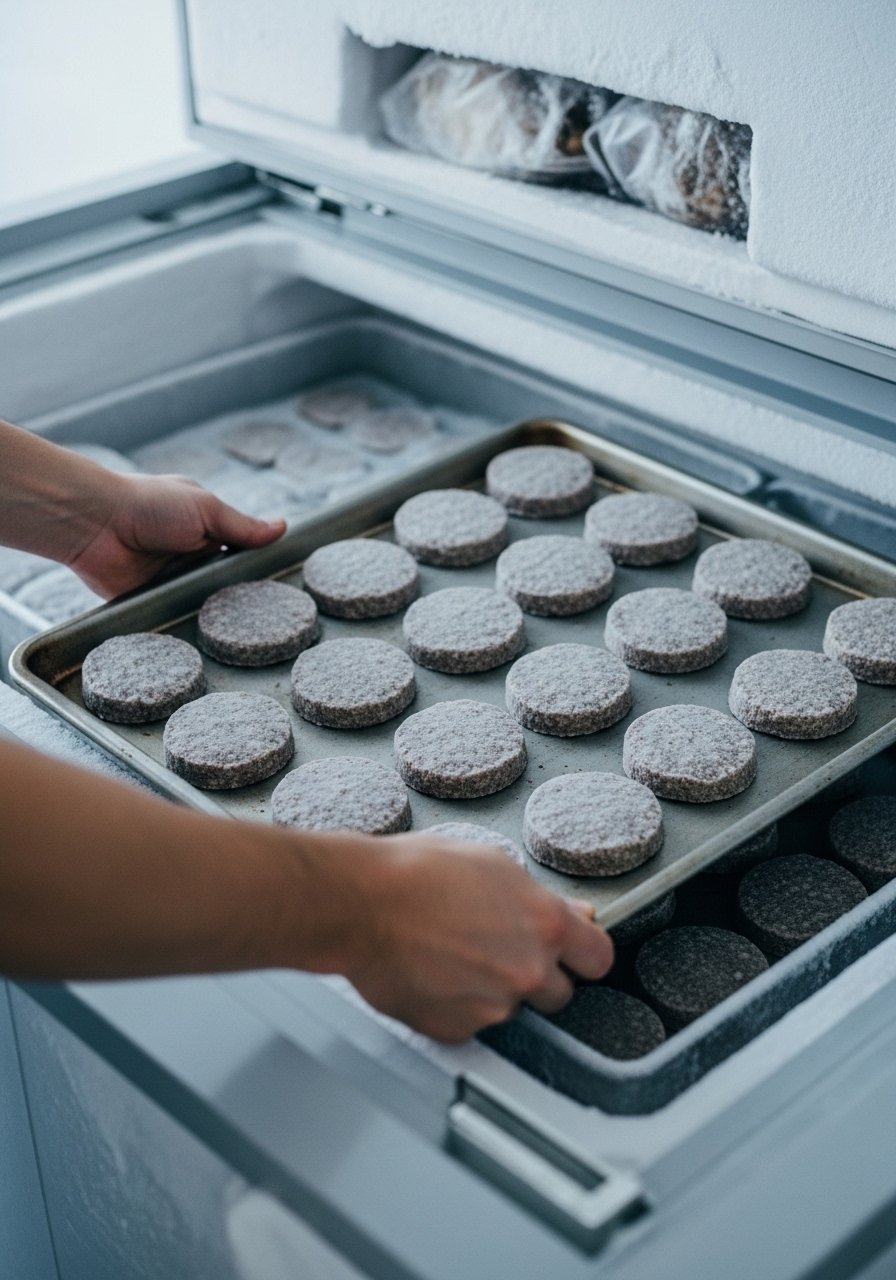 Once patties are solid, stack with a piece of parchment between each or keep single layers. Transfer to a freezer-grade bag and squeeze as much air out as possible before sealing. For best long-term texture, vacuum-seal individual portions (vacuum sealer machine) to remove air and protect flavor.