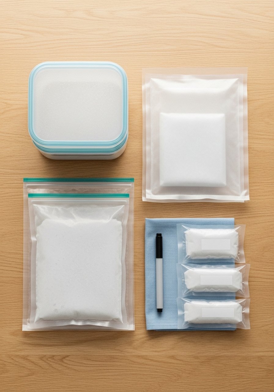 Choose heavy-duty freezer bags (freezer bags) or vacuum pouches. Remove excess air by hand or with the sealer to reduce freezer burn.