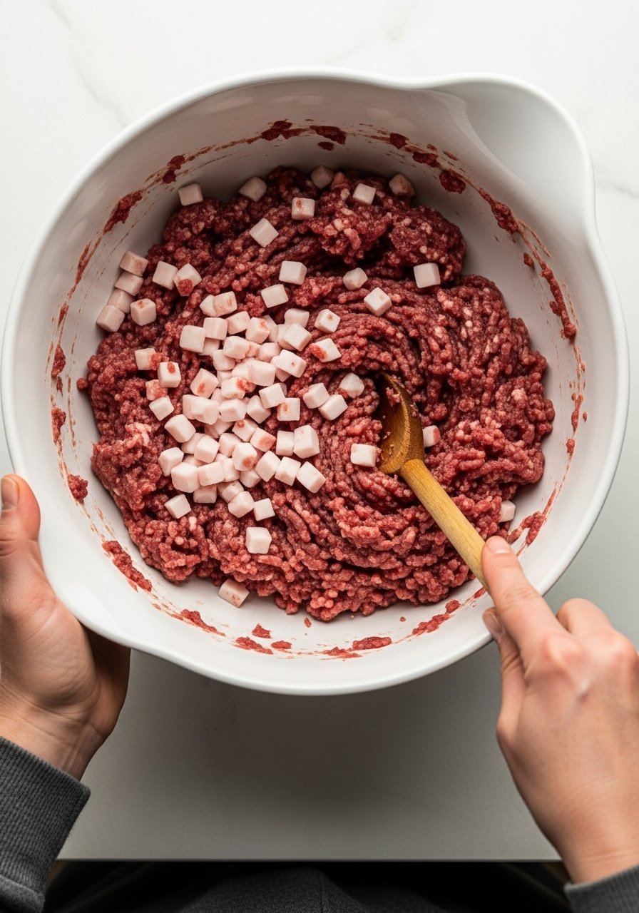 - Pork fat or ground beef (20% fat): 20–25% of total meat weight for juiciness and cohesion.