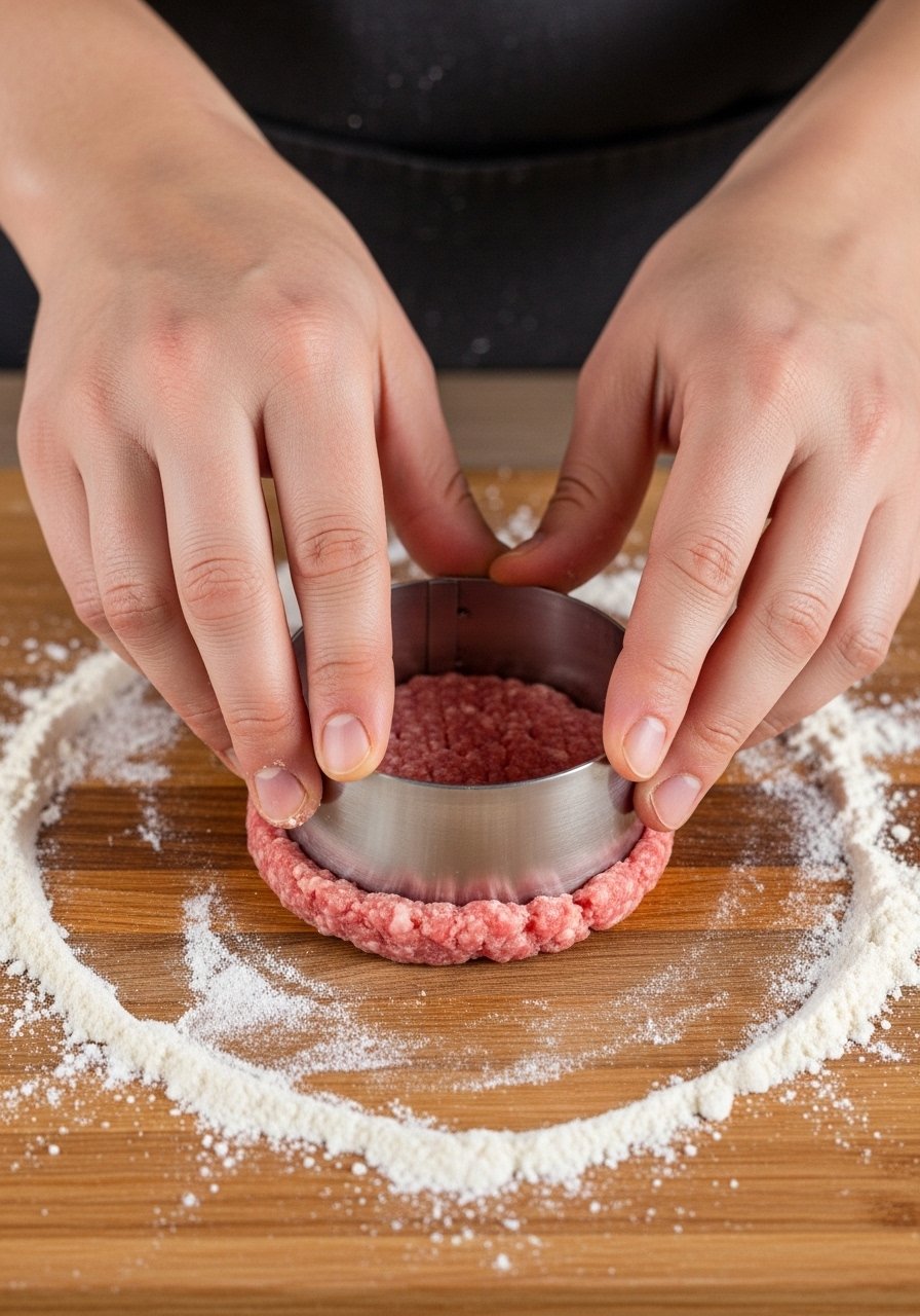 Work with meat and fat straight from the fridge. Cold ingredients hold structure better; warm meat becomes sticky and shears apart. Use a kitchen scale to portion even patties — 4–5 ounces is a practical size.