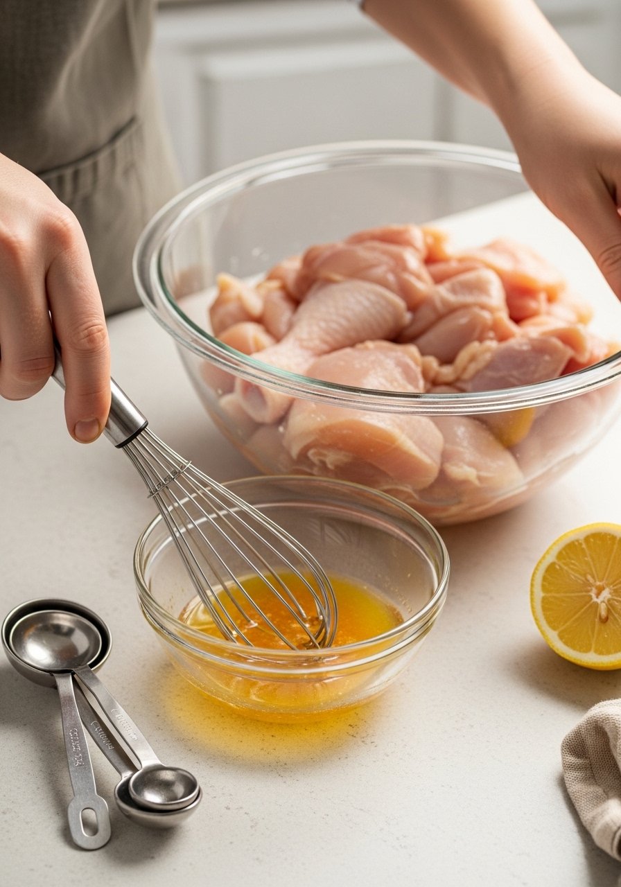 Use a zip-top bag or a shallow container so the chicken is coated evenly. Bags are great because you can press out extra air and get full contact with less marinade.