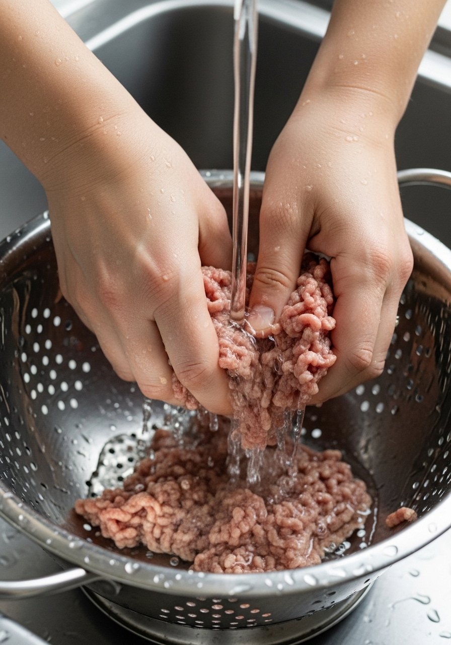 Put the ground deer meat in a stainless steel colander and run very cold water through it for 1–2 minutes, breaking the meat apart with your fingers. Let the water run until it’s noticeably clearer.
